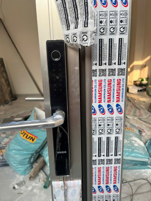 Hình ảnh trực diện của khóa Siker KTS 151 lắp trên cửa nhôm.Chú thích ảnh: Cận cảnh thiết kế sang trọng và tinh tế của khóa thông minh Siker KTS 151 phiên bản mới nhất.