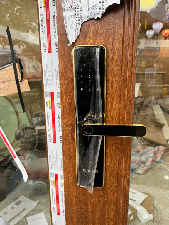 Chú thích ảnh: Khóa thông minh SIKER KTS 100 lắp đặt thực tế trên cửa nhựa composite vân gỗ sang trọng.