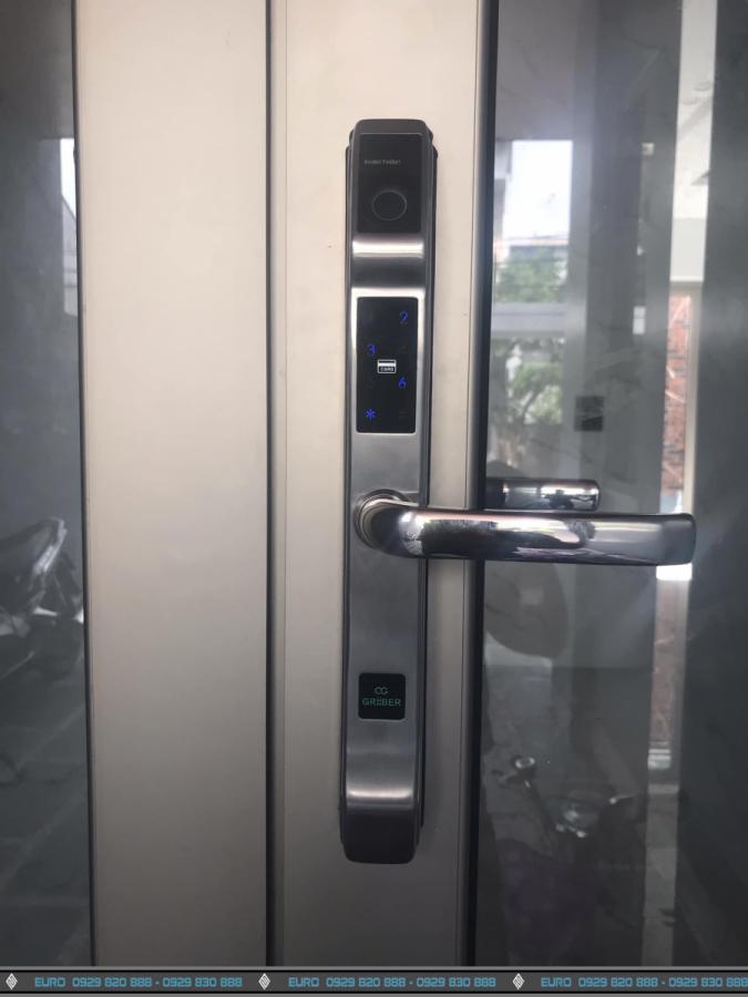 CỬA ĐI 2 CÁNH GROBER MÀU VÀNG SÂM BANH DÙNG KHÓA VÂN TAY