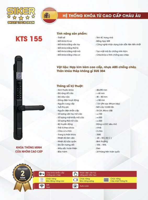 Khóa điện tử Siker Spain là dòng đa dạng mẫu khóa, phù hợp các loại cửa gỗ, cửa kính, cửa nhựa, cửa nhôm xingfa, cửa sắt.. Mở khóa bằng nhiều chức năng như: Mở bằng điện thoại từ xa không giới hạn khoảng cách; Vân tay cảm biến sinh học; Mã số; Thẻ từ; Chìa cơ vi tính; Nhận diện gương mặt; Quản lý qua app…