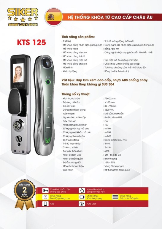 Là một trong những sản phẩm đẳng cấp đến từ nhà Siker, khóa thông minh cho cửa gỗ Siker KTS 125 sở hữu nhiều tính năng cực kỳ hiện đại. Cảm biến vân tay của khóa cực kỳ nhạy, có thể nhận vân tay ngay cả khi ngón tay dơ hoặc ướt. Ngoài ra, khóa còn có chức năng mở bằng nhận diện gương mặt, giúp anh chị có thể mở cửa một cách nhanh chóng.