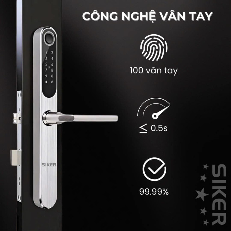 1. Khóa SIKER KTS 109: Công nghệ vân tay siêu nhạy và chính xác Công nghệ vân tay là trái tim của khóa SIKER KTS 109. Với khả năng nhận diện lên đến 100 dấu vân tay, khóa cho phép nhiều thành viên trong gia đình hoặc người thân tin cậy dễ dàng ra vào. Đặc biệt, tốc độ nhận diện chỉ dưới 0.5 giây cùng với độ chính xác lên đến 99.99%, đảm bảo mở khóa nhanh chóng và an toàn tuyệt đối.