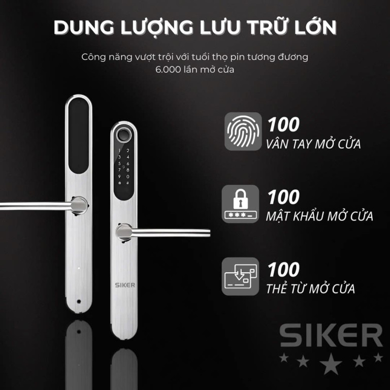 3. Khóa SIKER KTS 109: Dung lượng lưu trữ lớn - Pin bền bỉ Khóa SIKER KTS 109 được trang bị khả năng lưu trữ ấn tượng: 100 vân tay, 100 mật khẩu và 100 thẻ từ. Điều này đặc biệt hữu ích cho các gia đình đông người hoặc văn phòng. Hơn nữa, với tuổi thọ pin lên tới 6.000 lần mở khóa, bạn có thể hoàn toàn yên tâm sử dụng mà không cần lo lắng về việc thay pin thường xuyên.