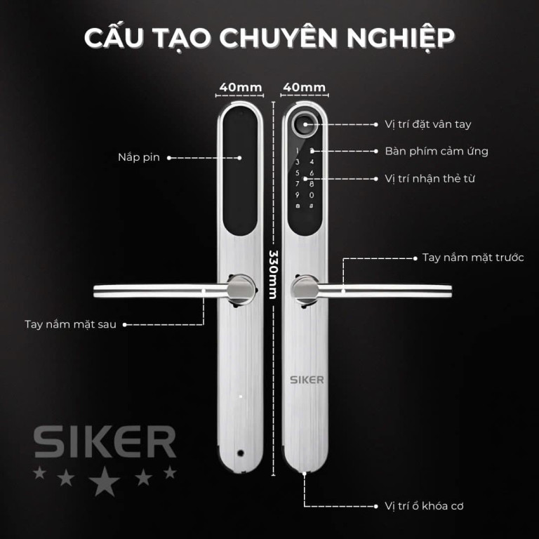 4. Khóa SIKER KTS 109: Cấu tạo chuyên nghiệp và thiết kế tinh tế SIKER KTS 109 được thiết kế với kích thước tiêu chuẩn (chiều dài 330mm, chiều rộng 40mm) và cấu tạo chuyên nghiệp, đảm bảo tính thẩm mỹ và độ bền cao. Các bộ phận như vị trí đặt vân tay, bàn phím cảm ứng, vị trí nhận thẻ từ, tay nắm mặt trước/sau và vị trí ổ khóa cơ được bố trí khoa học, dễ dàng sử dụng.