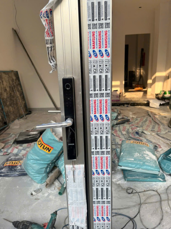 Hình ảnh trực diện của khóa Siker KTS 151 lắp trên cửa nhôm.Chú thích ảnh: Cận cảnh thiết kế sang trọng và tinh tế của khóa thông minh Siker KTS 151 phiên bản mới nhất.