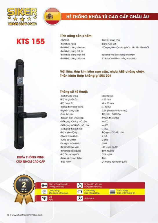 (Bảng thông số kỹ thuật chi tiết của Khóa thông minh Siker KTS155)