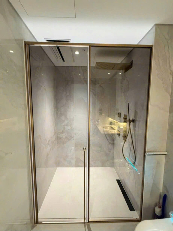 Cabin kính với phụ kiện nhôm xi mạ giấu bản lề mang lại sự liền mạch trong thiết kế. Mẫu cửa mở quay mẫu thẳng giúp không gian trở nên rộng rãi, sạch sẽ và hiện đại hơn. Bản lề được giấu khéo léo trong khung nhôm, mang lại tính thẩm mỹ cao và dễ dàng vệ sinh.